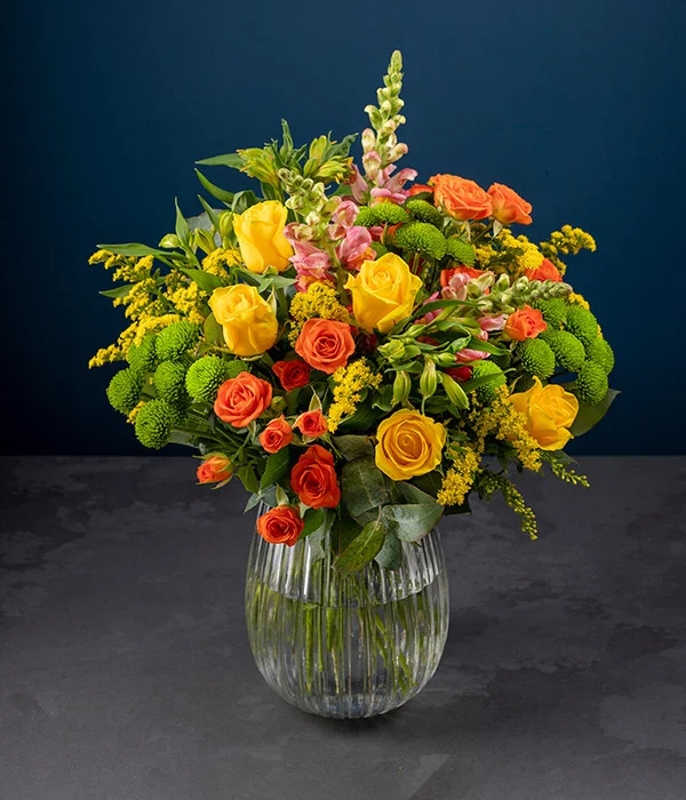 Bring the sunshine indoors with our beautiful Summer Roses bouquet. Containing a bright mix of long-lasting yellow alstroemeria, orange spray roses, yellow roses, solidago, and santini. Complemented with elegant seasonal foliage. Perfect for making those gloomy days feel brighter.
